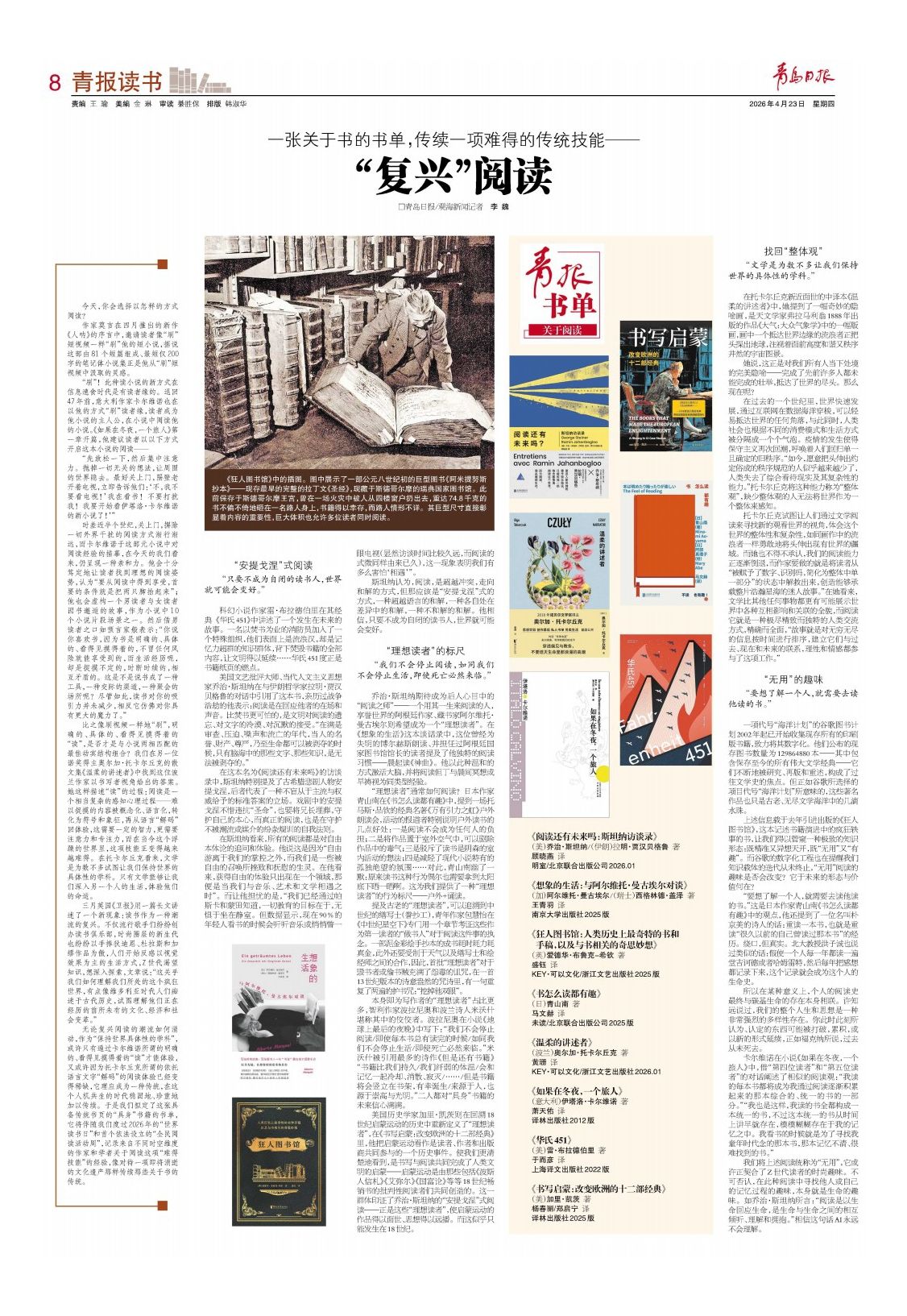 无论复兴阅读的潮流如何涌动,作为“保持世界具体性的学科”,或许只有通过卡尔维诺所谓的明确的、看得见摸得着的“读”才能体验,又或许因为托卡尔丘克所谓的依托语言文字“解码”的阅读体验已经变得稀缺,它理应成为一种传统,在这个人机共生的时代稳固地、珍重地加以传续。于是我们拟定了这张具备传统书页的“具身”书籍的书单,它将伴随我们度过2026年的“世界读书日”和首个依法设立的“全民阅读活动周”,记录来自不同时空维度的作家和学者关于阅读这项“难得技能”的经验,像对待一项即将消逝的文化遗产那样传续那些关于书的传统。