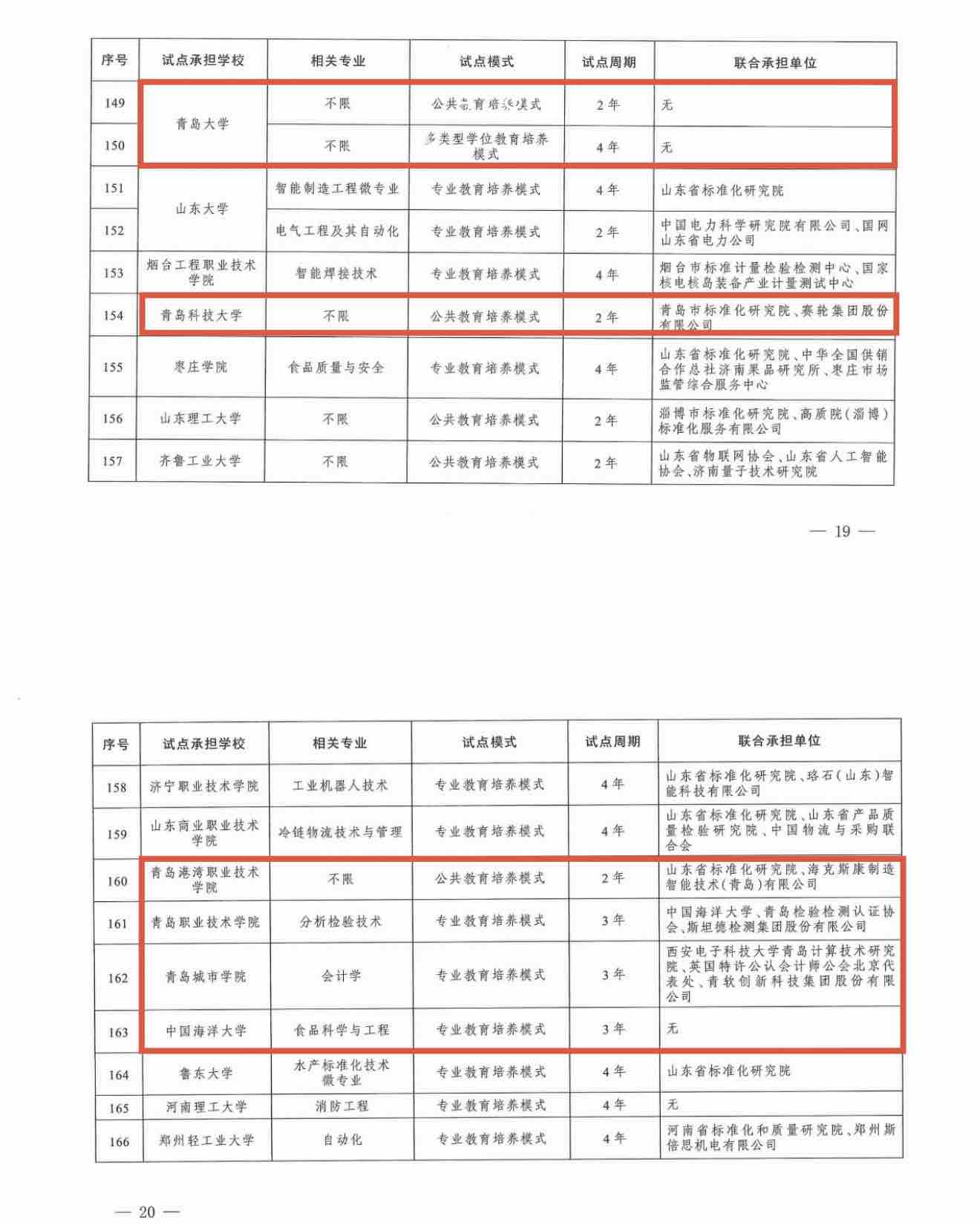 我市入选的试点承担学校包括中国海洋大学、青岛大学、青岛科技大学、青岛港湾职业技术学院、青岛职业技术学院、青岛城市学院。相关试点专业涉及食品科学工程、分析检验技术、会计学等。培养模式包括专业教育培养模式、公共教育培养模式、多类型学位教育培养模式。