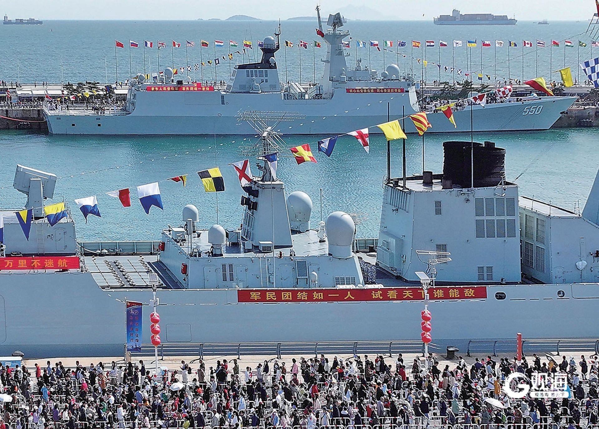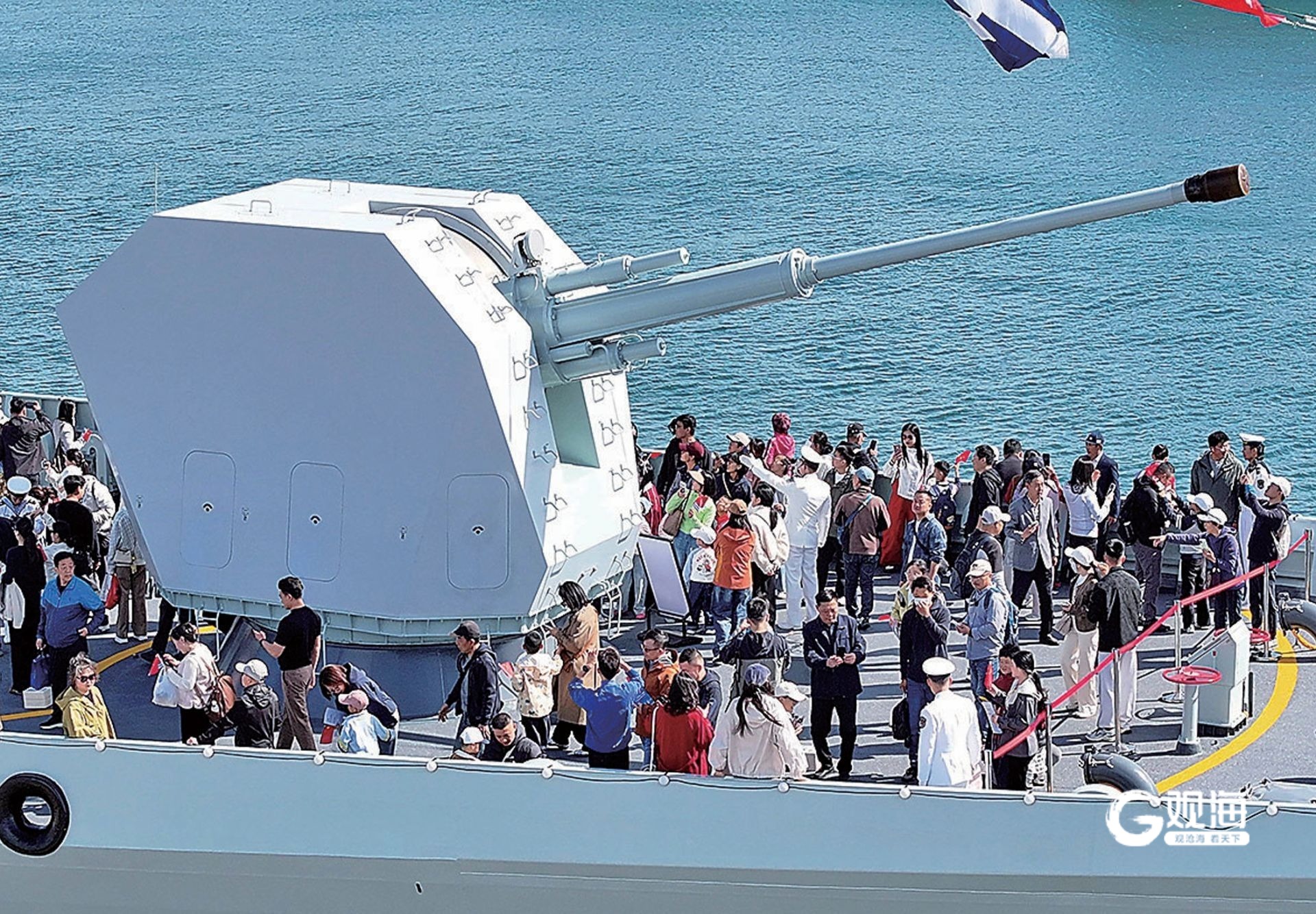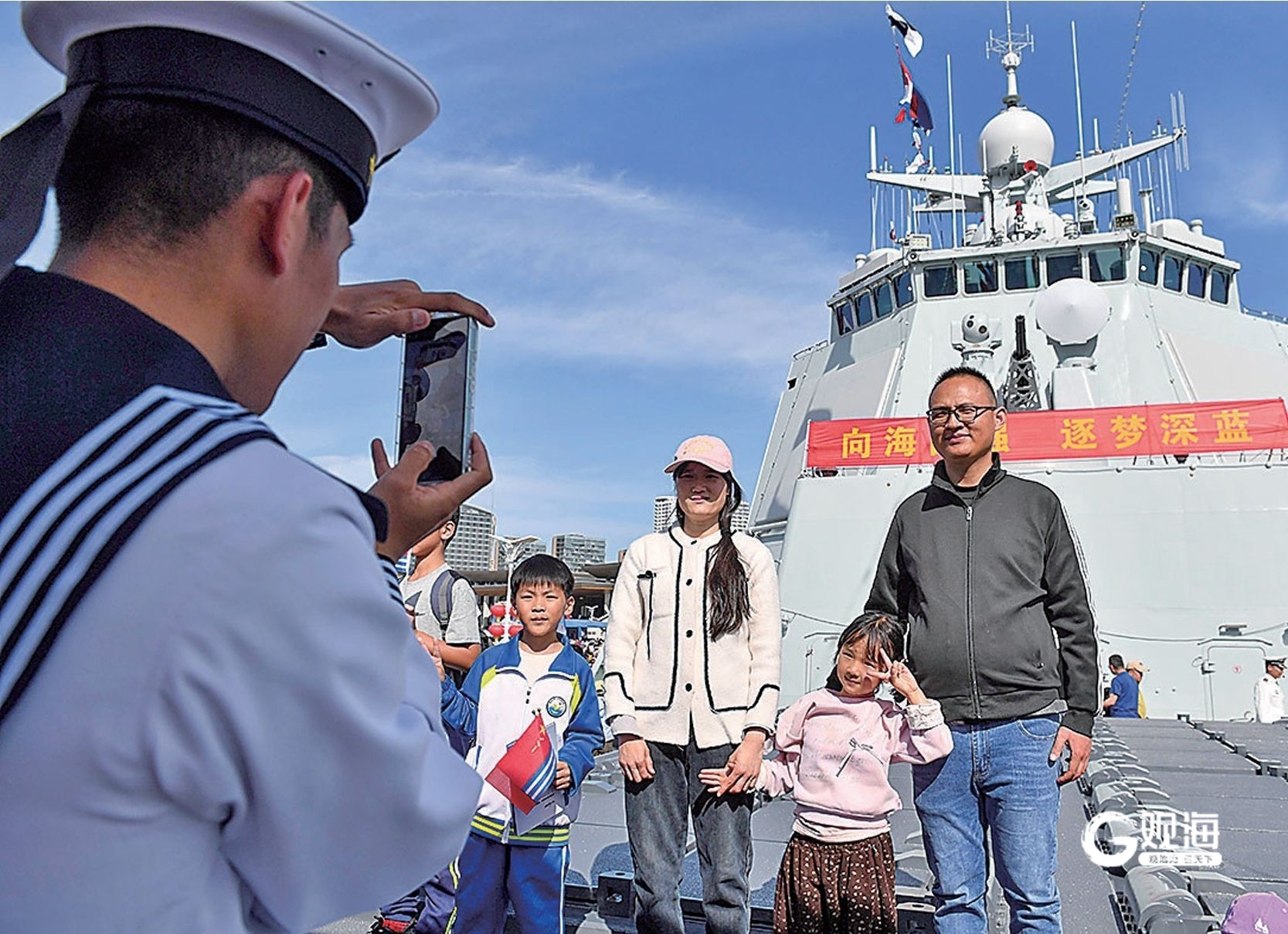 青岛港三号码头,齐齐哈尔舰、芜湖舰、东平湖舰、阳澄湖船犹如钢铁巨兽横卧碧波,以挂满旗的最高礼仪,欢迎来自全国各地的参观者。在海军官兵的引导下,参观群众依次登上舰艇,近距离观摩舰载装备、了解舰艇性能,聆听官兵讲述海军建设发展的故事。甲板上、舰舷边,不少市民游客驻足拍照,在沉浸式体验中感受国防强大、厚植爱国情怀。