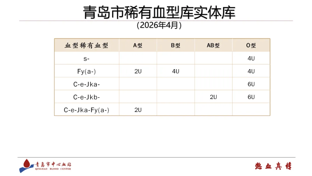 截至2026年4月,青岛市中心血站的固定献血者红细胞血型基因库,已经入库了13199份献血者的血型信息,占红细胞总库存的15%以上,为稀有血型保障工作打下了坚实基础。为了更好地保障稀有血型患者用血,血站还对稀有血型进行了精细化管理,将多种特殊表型的献血者纳入稀有血型范围,通过信息系统规范管理,建成了完善的“稀有血型数据库”。目前,数据库里已经登记了各类稀有血型献血者,如s-表型13人、Fy(a-)表型47人、C-e-Jk(a-)表型288人、C-e-Jk(b-)表型267人等,同时工作人员还会向这些献血者普及相关知识、做好告知工作,搭建起稀有血型应急保障的“信息中枢”。