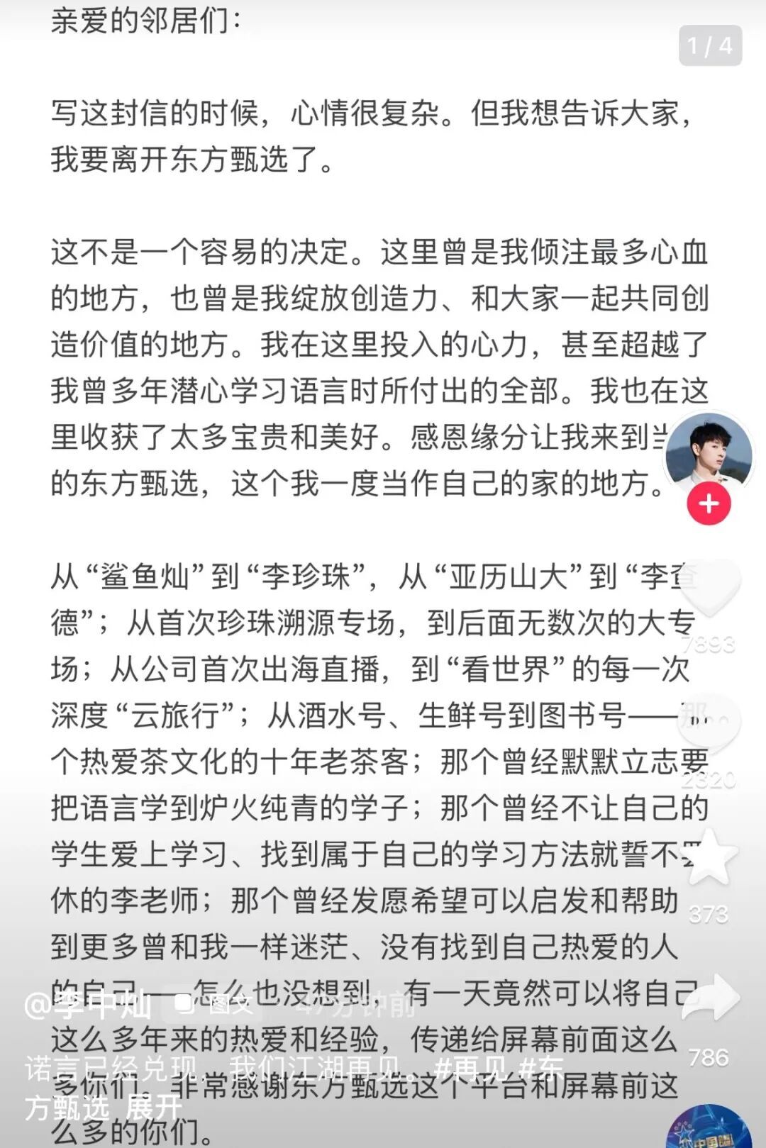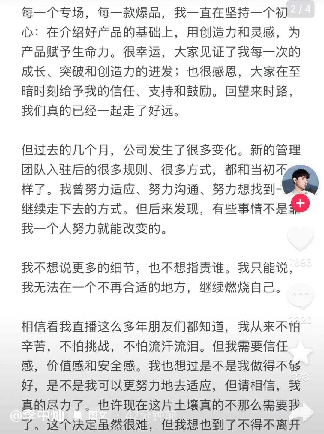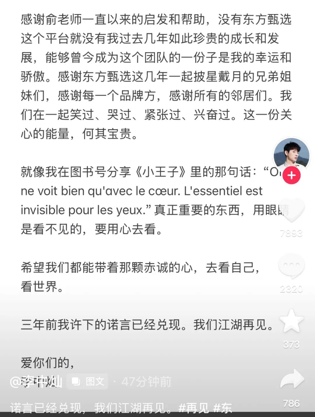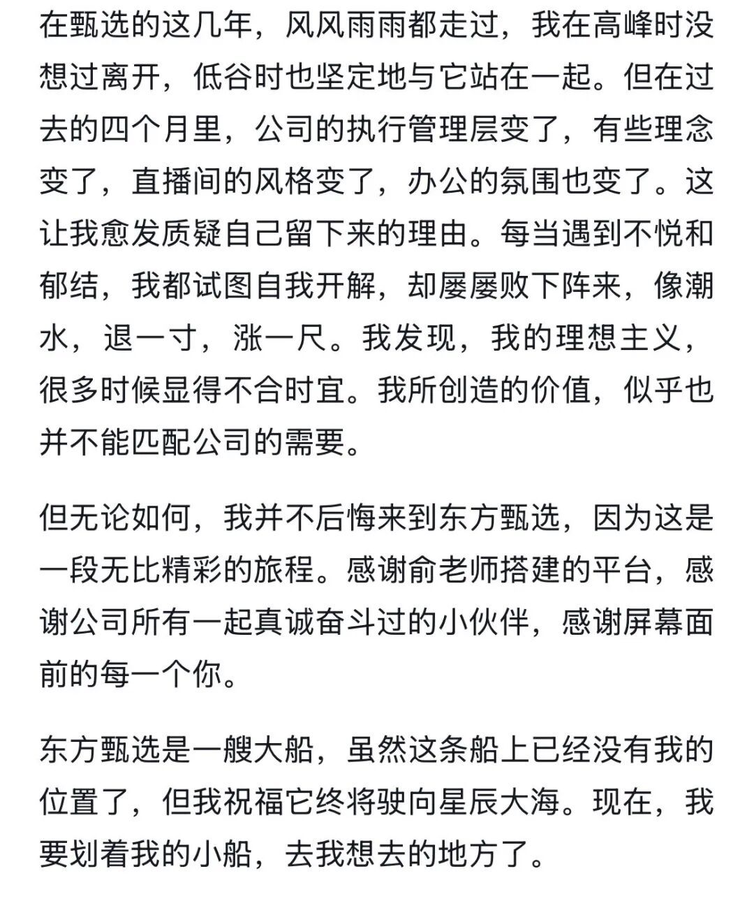 4月25日下午,东方甄选明明在社交账号发文回应离职,原文如下:由衷地感谢俞老师对我的栽培和厚爱。我在这里度过了人生最重要的一些日子,也留下了无数刻骨铭心的回忆,这段闪亮的岁月,共计 1571 天。在无数个风轻云柔的夜晚,我仰望着清朗的月亮,想着未来,山高水长。但新领导入驻后,公司整体直播模式与运营风格彻底改变,这种文化上的转变,我很难认同。日常工作中,我能清晰感受到新任管理层对我的“不友好”,让我陷入了严重的焦虑和内耗。我也曾试着理解,适应和配合,但是还是发现自己被推到了更远的位置,没有争吵,没有冲突,而是一种安静的“隔离”,所以我意识到那个我曾经用力守护的家园,已经不需要我了。也许确实是我适应力不够好,但人只活一次,我希望能以自己喜欢的方式度过,所以我选择了离开。