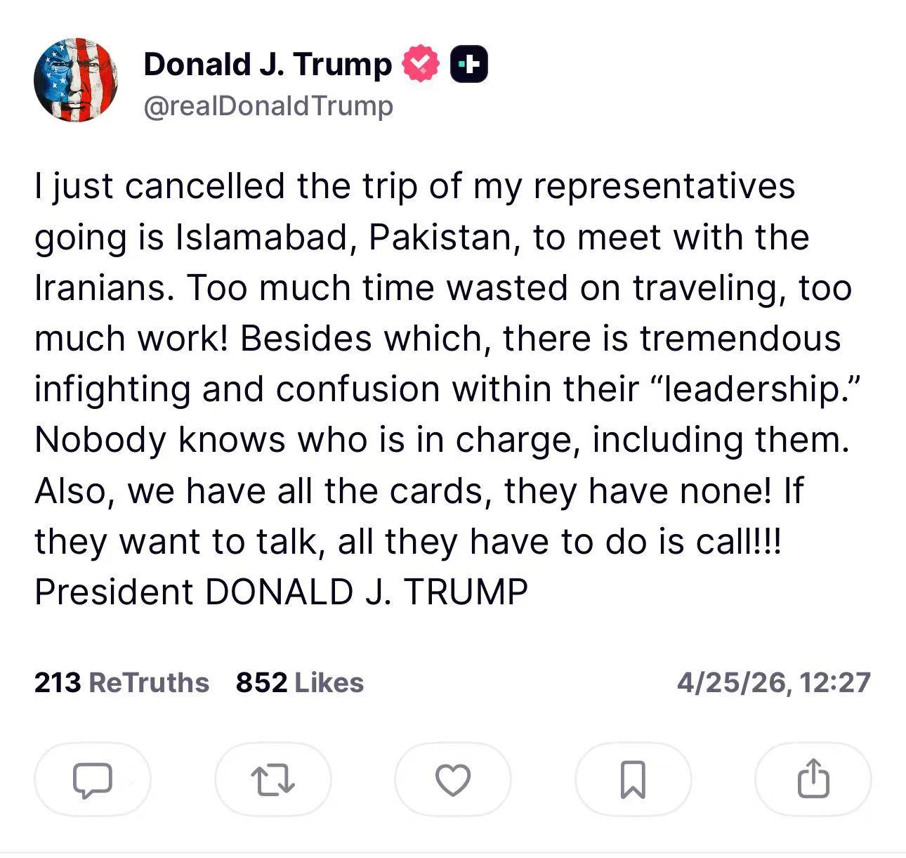 在伊朗代表团结束对巴基斯坦的访问之后,美国总统特朗普25日在社交媒体上宣布,他取消了美方代表前往巴基斯坦首都伊斯兰堡“与伊朗方面会晤”的行程。