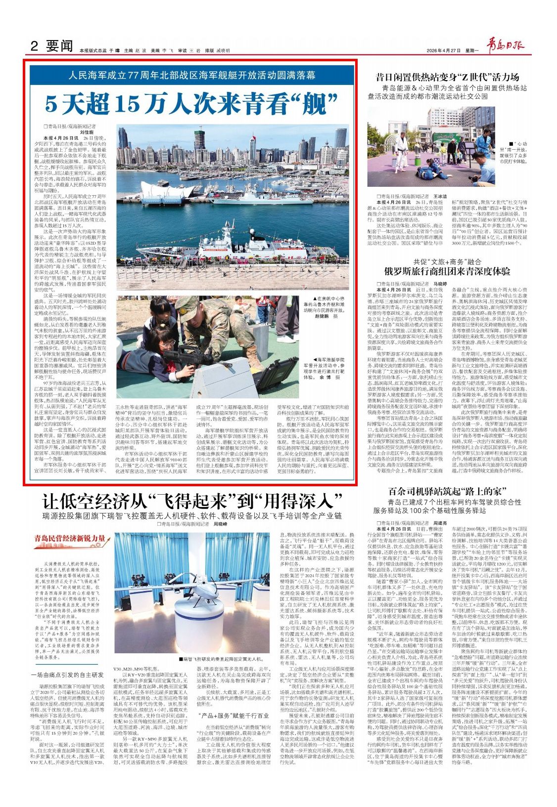 舰行万里不迷航,军民同心筑国防。舰艇开放活动是人民海军强军成就的集中展示,是全民国防教育的生动实践,也是军民鱼水情的深刻体现。青岛将以此次活动为契机,持续弘扬拥军优属、拥政爱民的光荣传统,深化全民国防教育,谱写向海图强的壮丽篇章。人民海军必将满载人民的期盼与重托,向着更远深蓝、更强目标奋勇前行。(青岛日报/观海新闻记者 刘佳旎)