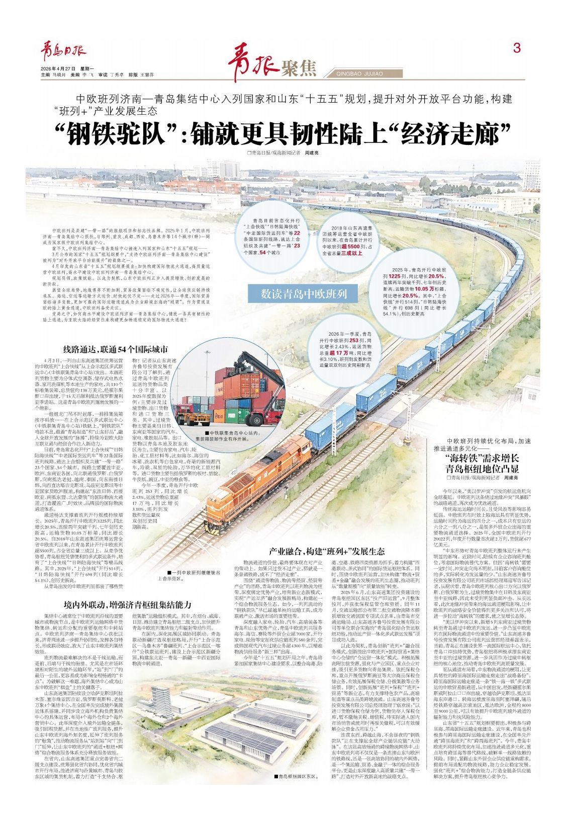 围绕“通道带物流、物流带经贸、经贸带产业”的思路,青岛中欧班列以班列物流为纽带,深度绑定优势产业,培育新业态新模式,实现“产运互济”融合发展新格局,构建起一个综合物流服务生态。如今,一列列流动的“钢铁驼队”早已超越单纯的运输工具,成为联通产业、激活市场的重要纽带。