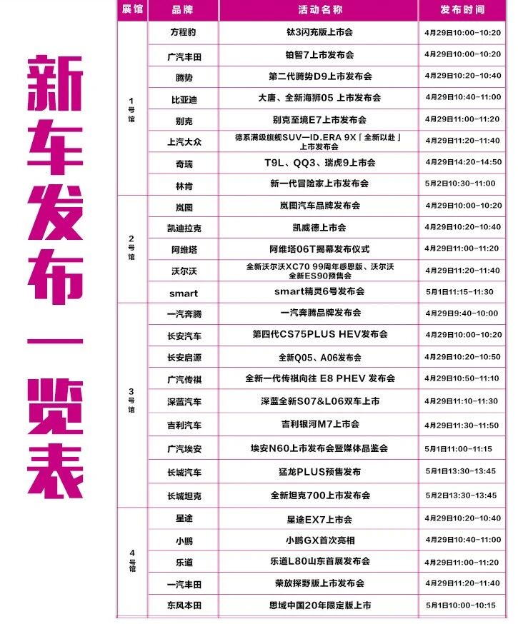 本届展会,27场品牌发布活动现场进行。新一代小米SU7、全新坦克700、魏牌V9X、尚界Z7/Z7T、哈弗猛龙PLUS、零跑D19、上汽奥迪E7X、一汽奥迪全新A6L、智界V9、iCAR V27、凯迪拉克凯威德、阿维塔06T、小鹏GX、华境S、岚图泰山X8、上汽大众ID.ERA 9X、全新smart #6 EHD、沃尔沃全新ES90、全新林肯冒险家、广汽埃安N60、乐道L80、长安汽车第四代CS75PLUS HEV、星途EX7、比亚迪大唐、比亚迪海狮05、全新奇瑞QQ3 EV、别克至境E7、吉利银河M7、问界M6……几十款品牌新车将于青岛国际车展做山东区域战略发布或精彩展示。