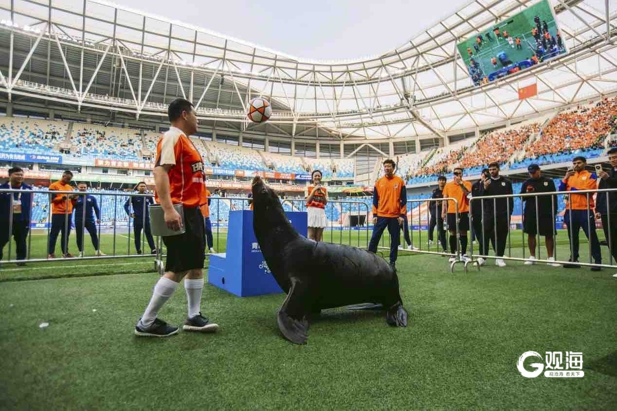 作为青岛极地的人气动物明星,海狮"好客"首次跨界走进足球赛场,带来精心编排的足球主题表演。“好客”通过“站立挥手”与观众热情互动;随后接连展示平衡顶球、连贯颠球以及高难度倒立顶球等拿手绝技,展现出日常扎实的训练成果与出色表现力,赢得观众阵阵掌声。