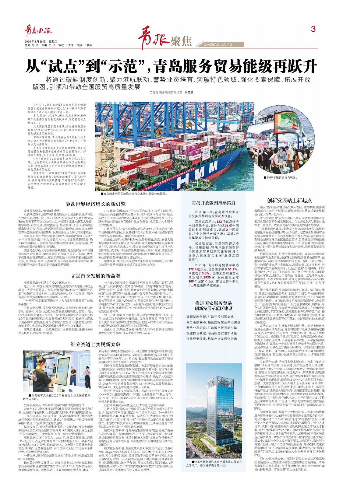 破题制度创新,打造开放引领高地。青岛将统筹推进制度创新与业态升级,全面落实跨境服务贸易负面清单,在数字贸易、金融、法律等领域扩大开放。依托上合示范区,深化数据跨境流动与专线试点,探索金融、工业互联网、医疗等领域低风险数据目录,为企业“出海”扫清障碍。同时联合税务、外汇部门优化流程,推广电子凭证申报、简化跨境收付审核,让服务出口更高效、更便捷。立足港航物流、数字服务、影视文化等优势,青岛力争每年推出3至5项全国首创案例,把地方探索转化为可复制、可推广的制度经验。