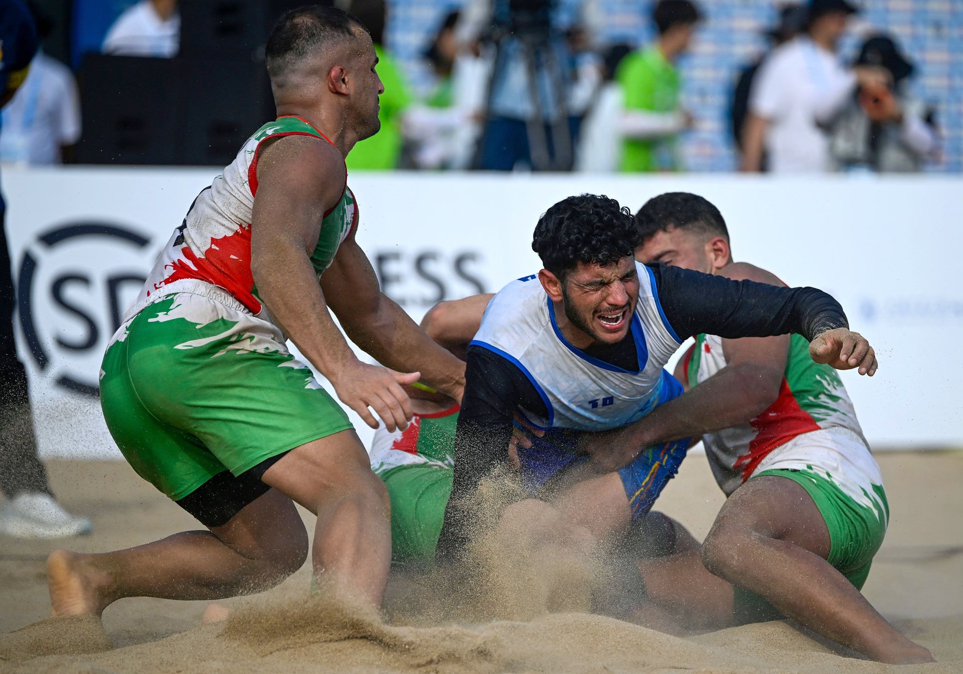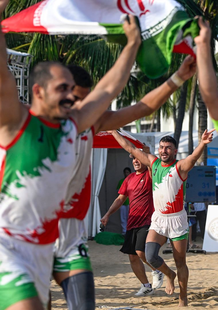 在27日进行的第六届亚沙会沙滩卡巴迪男子决赛中,伊朗队44:31击败印度队,以全胜战绩夺冠。赛后队员们展开两面国旗,高举着绕场庆祝,而后又把国旗铺在地上跪地亲吻。