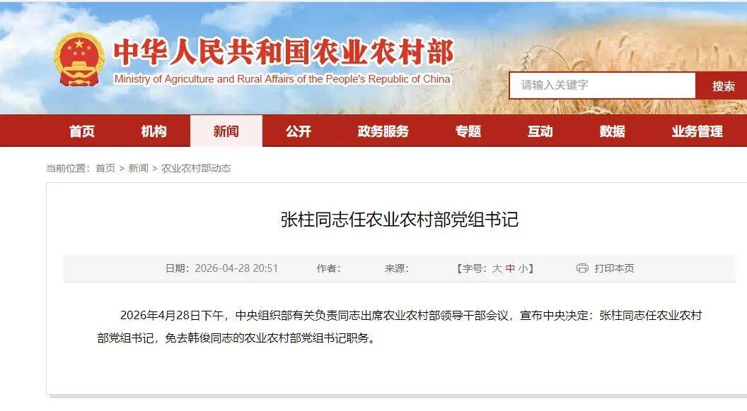 中央决定:张柱同志任农业农村部党组书记 2026-04-28 22:21 农业农村部官网 0 据农业农村部消息,4月28日下午,中央组织部有关负责同志出席农业农村部领导干部会议,宣布中央决定:张柱同志任农业农村部党组书记,免去韩俊同志的农业农村部党组书记职务。 责任编辑:吕靖雯
