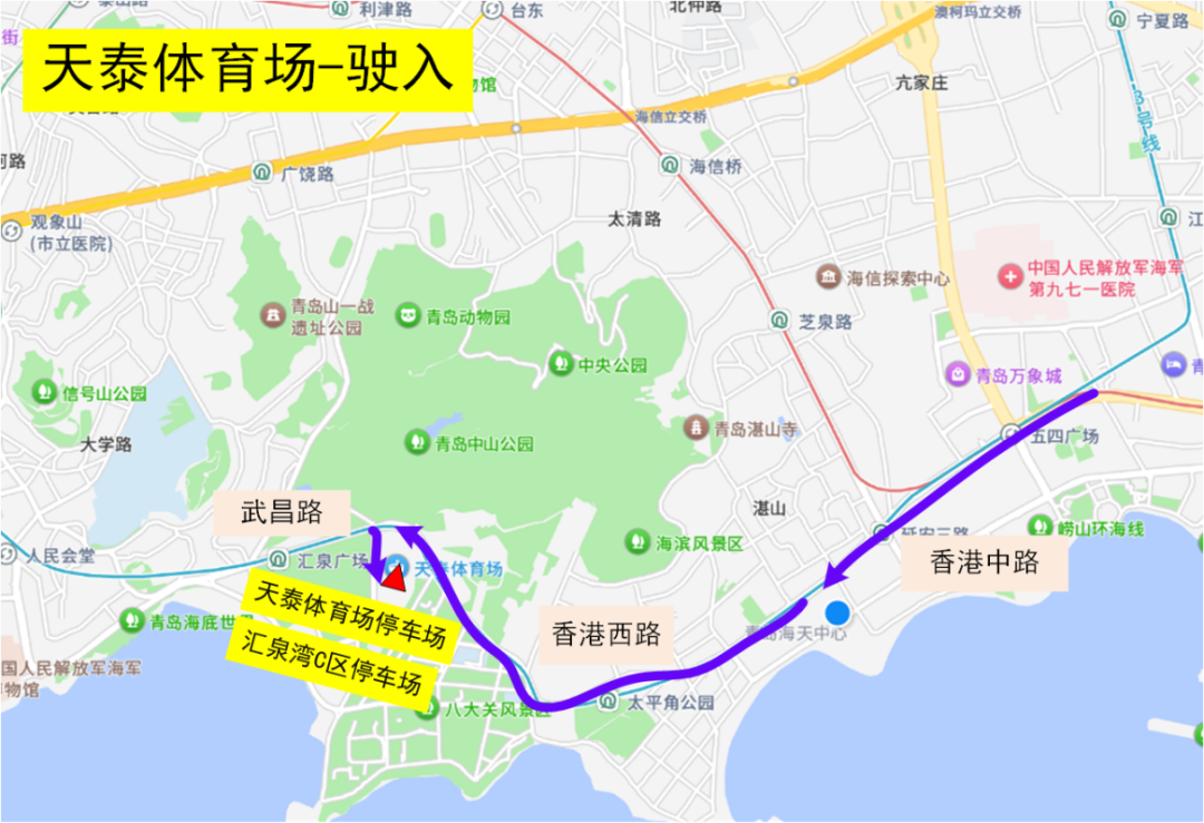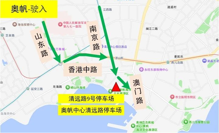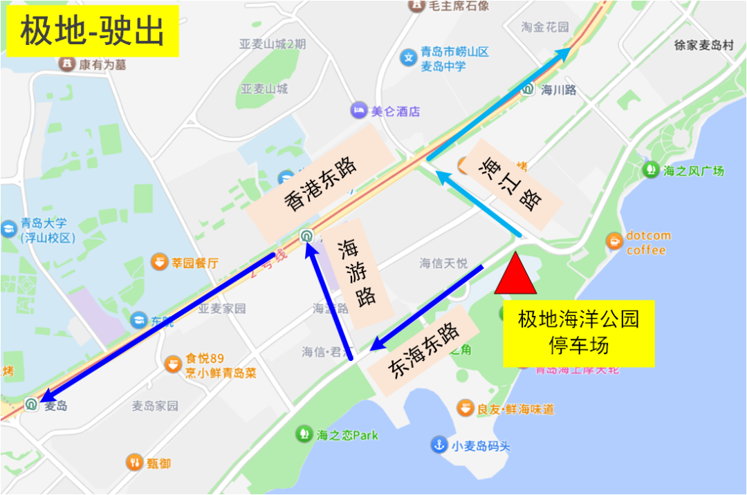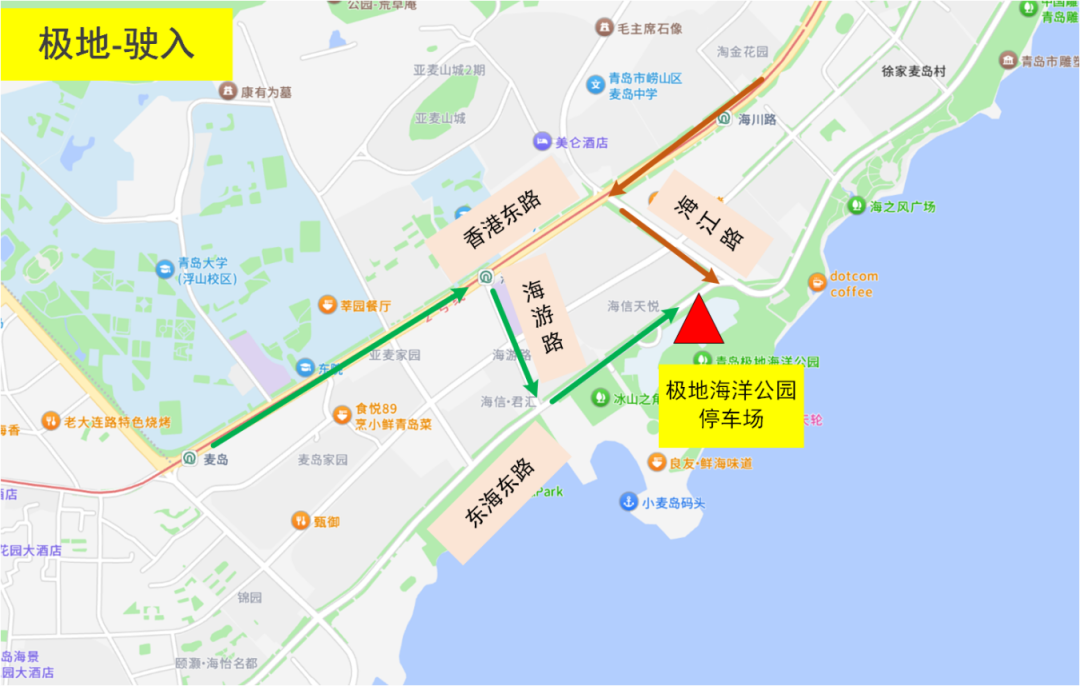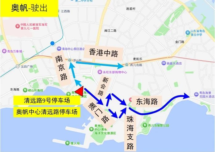 驶入1:香港东路西段→海游路→东海东路→停车场
