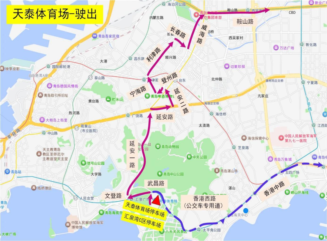 驶出2(备用路线):停车场→武昌路→香港西路(公交车专用道)→香港中路向东行驶