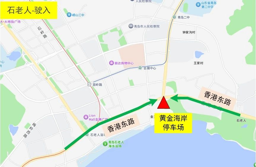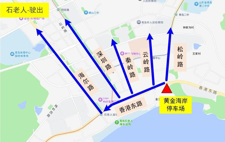 驶出:黄金海岸停车场→香港东路→海尔路/深圳路/松岭路/秦岭路/云岭路