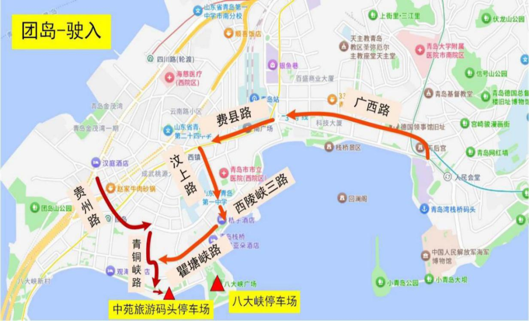 驶入:香港中路→香港西路→文登路→武昌路→停车场
