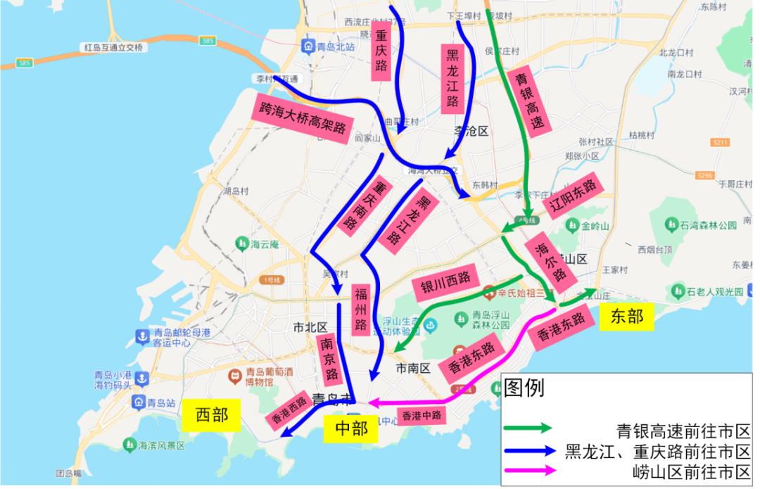 东部(小麦岛—石老人区域):跨海大桥高架路→海尔路→香港东路。