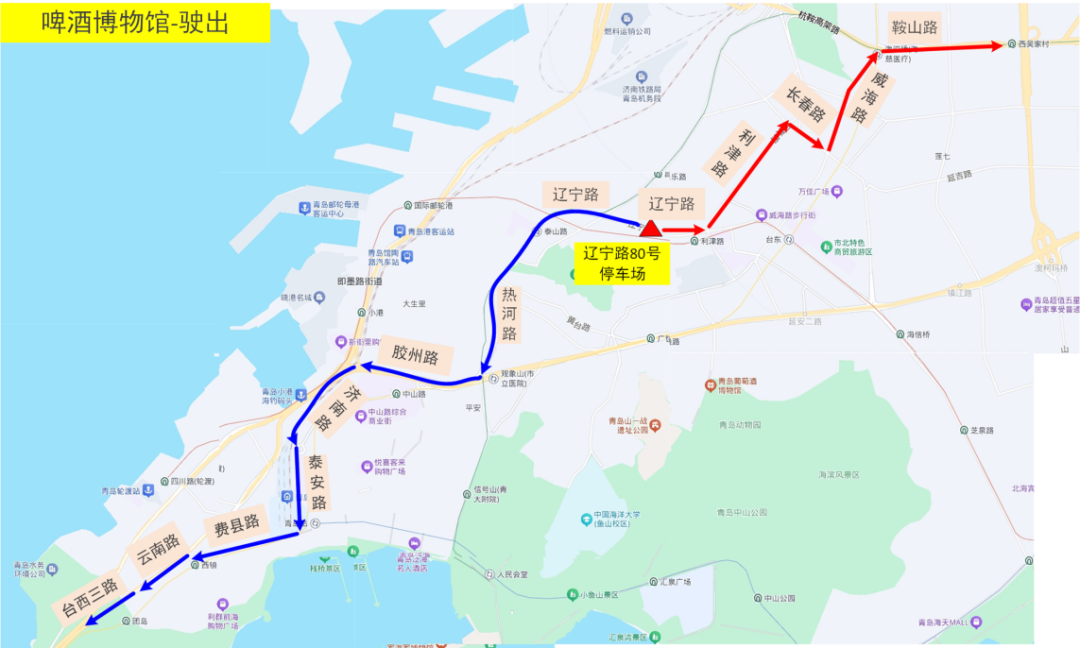 驶出2:辽宁路80号停车场→辽宁路→热河路→胶州路→济南路→泰安路→费县路→西藏路→云南路→台西三路