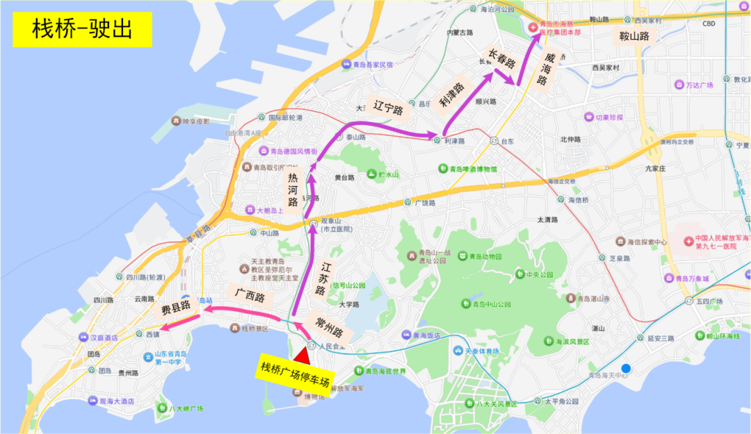 驶出:停车场→西陵峡路→西陵峡三路→汶上路→费县路→泰安路→济南路→沧口路→胶州路→江苏路/热河路