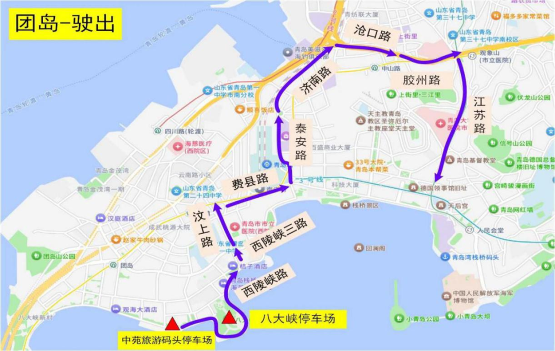驶出1:停车场→常州路→广西路→泰安路→费县路→团岛方向