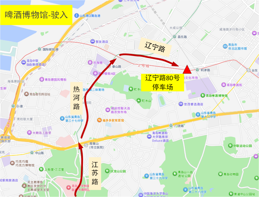 驶入:江苏路→热河路→辽宁路→辽宁路80号停车场