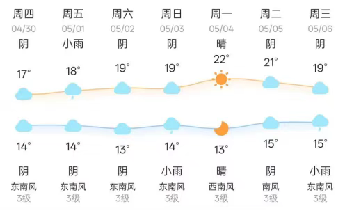 据气象部门预测,五一假期我市天气以多云为主,或有降雨,风力不大,最低气温12℃左右,最高气温22℃左右,适宜出行。