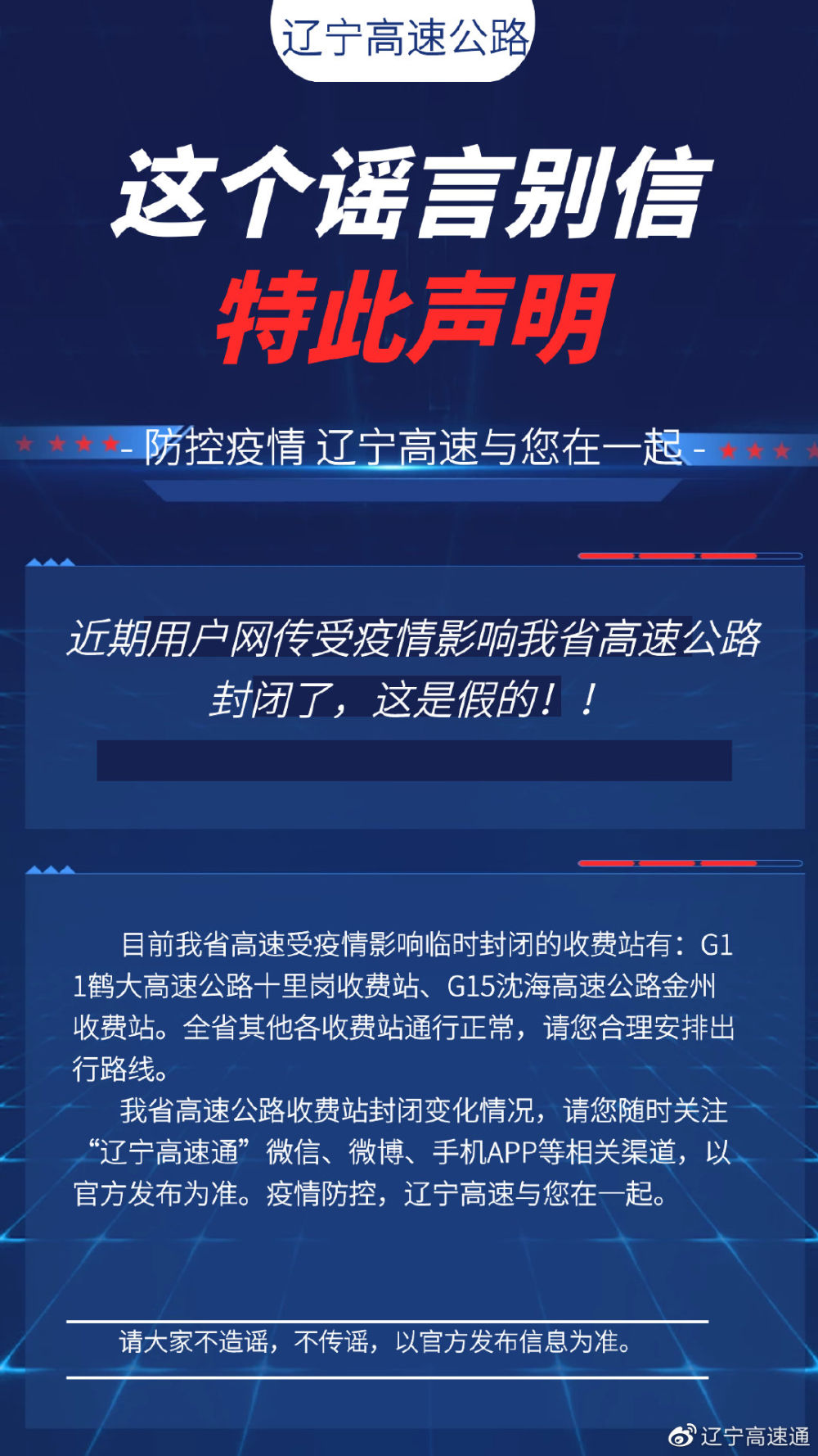 “辽宁省高速公路受疫情影响封闭”?辽宁高速:假的!