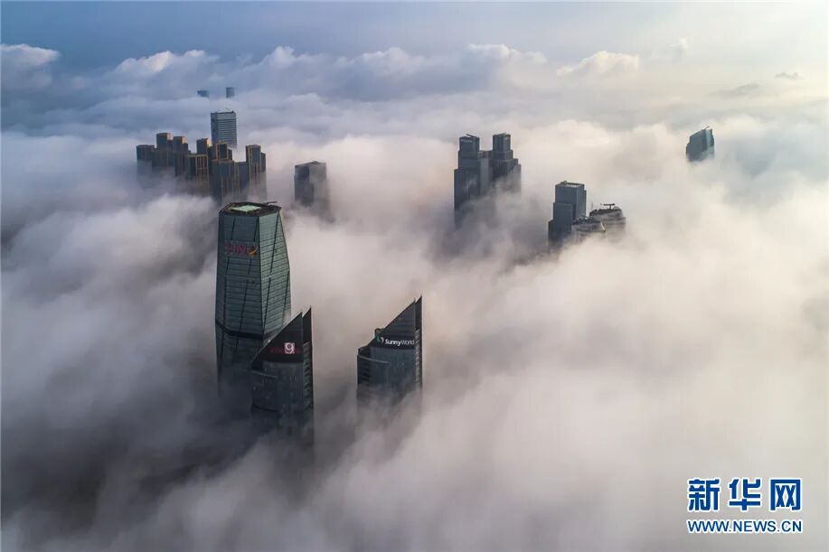 浮山湾平流雾,前海一线的建筑笼罩在云雾中,分外迷人。(摄影:王华 )