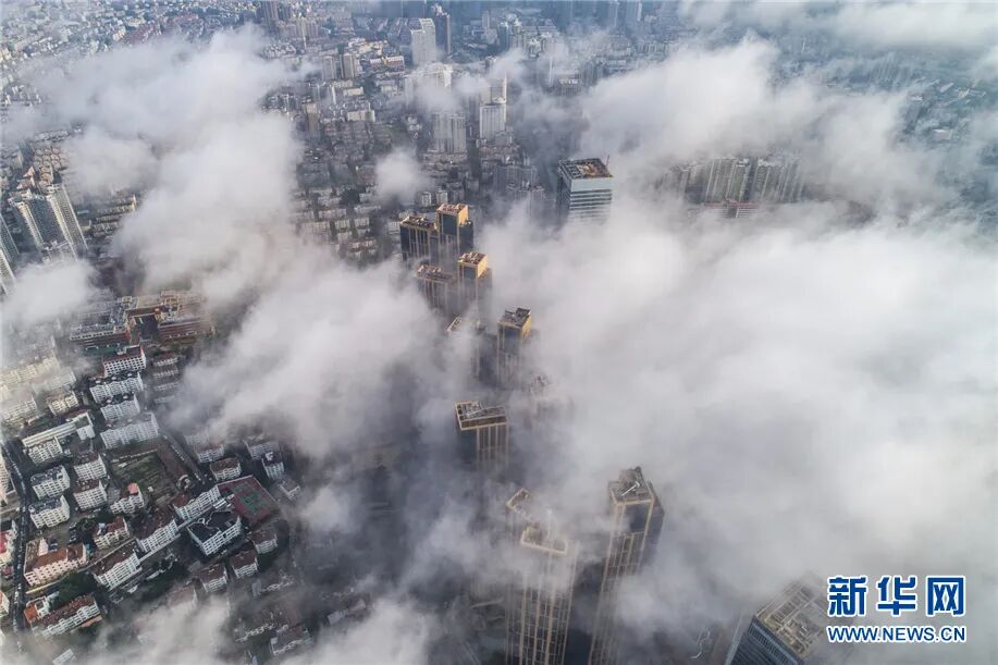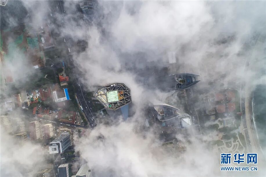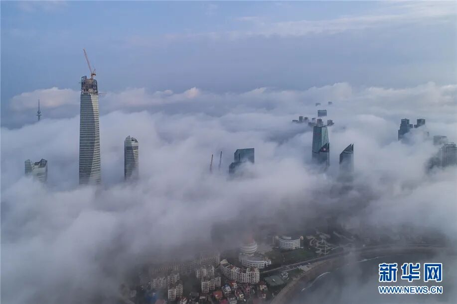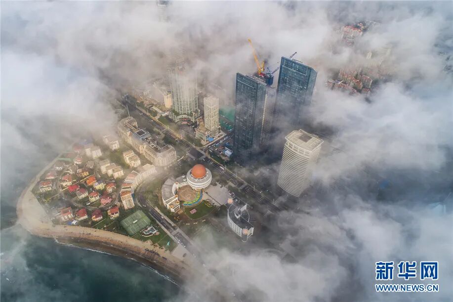 近日,青岛浮山湾沿海一带现平流雾景观,城市被一层雾气笼罩,高层建筑物“缠绕”其中,若隐若现,美景醉人。