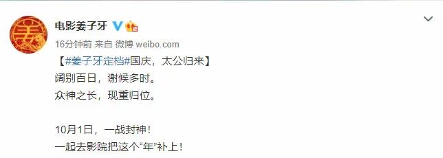 8月16日,电影《姜子牙》官方微博称,该片定档10月1日。