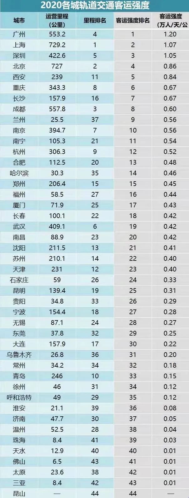 青岛成功杀进前十位,表现也不错。2020年,青岛轨道交通运营线路达到6条,运营车站105个,运营里程246公里,客运量13908.8万人次。