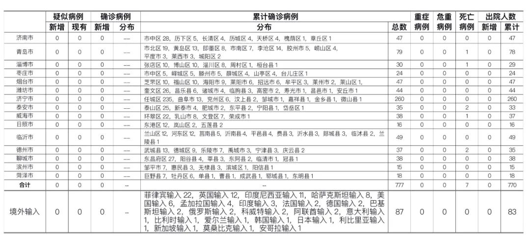 山东无新增本地疑似病例、确诊病例。累计报告确诊病例777例,死亡7例,治愈出院770例。