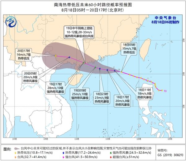 预计,该低压中心将以每小时20-25公里的速度向西偏北方向移动,强度逐渐加强,将于今天上午发展为今年第7号台风,随后逐渐向广东西部到海南东北部一带沿海靠近,并将于19日中午到晚上在广东阳江到徐闻一带沿海登陆(28-33米/秒,10-12级,强热带风暴级或台风级)。登陆以后向偏西方向移动,强度逐渐减弱。