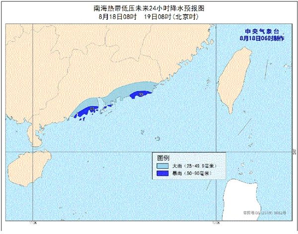 降水预报:18日08时至19日08时,广东南部沿海有大到暴雨(50-90毫米)。