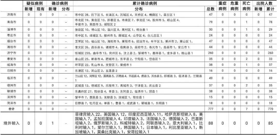 山东无新增本地疑似病例、确诊病例。累计报告确诊病例777例,死亡7例,治愈出院770例。