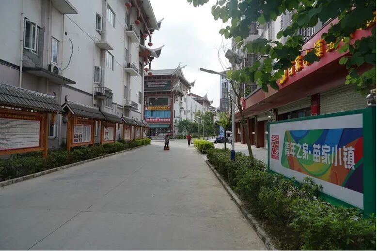 苗家小镇社区位于县城主干道两旁
