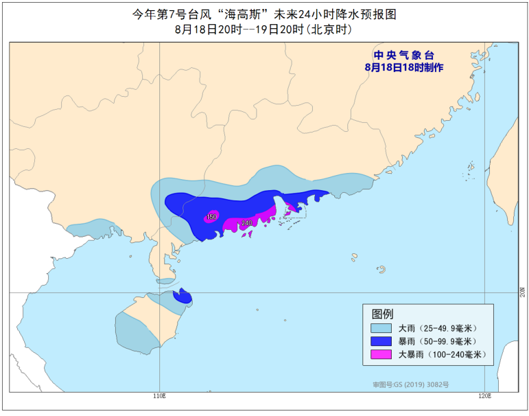 降水预报:18日20时至19日20时,海南岛西南部和东北部、广西东南部、广东西南部和南部沿海等地有大到暴雨,广东南部沿海部分地区有大暴雨(100-240毫米)。