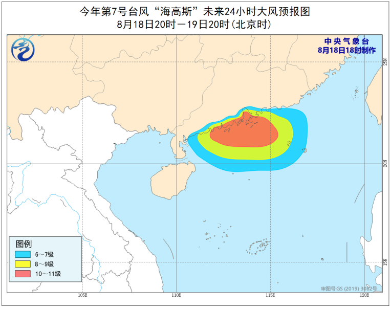 大风预报:18日20时至19日20时,南海西北部、广东沿海、珠江口区将有8-9级大风,部分海域或地区的风力有10级,“海高斯”中心经过的附近海面或地区的风力可达11-13级,阵风13-15级。