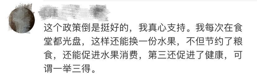 近日#江西理工大学食堂光盘换水果#冲上热搜,引发不少网友点赞!据介绍,学生吃完饭后,只要将“光盘”放至餐盘回收处,即可获得一个饭后水果作为奖励。