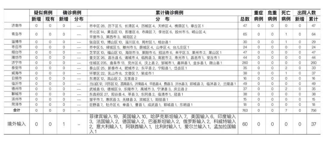 山东无本地住院疑似病例、确诊病例。累计报告确诊病例763例,死亡7例,治愈出院756例。