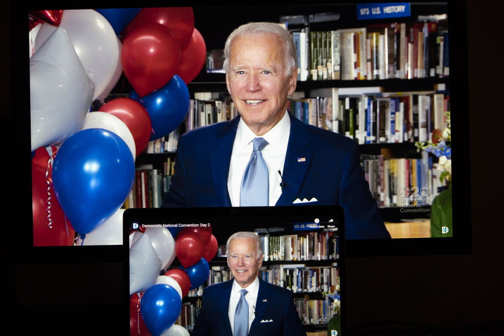 这张8月18日拍摄的直播视频画面显示,拜登被提名为2020年美国民主党总统候选人后庆祝。(新华社记者刘杰摄)