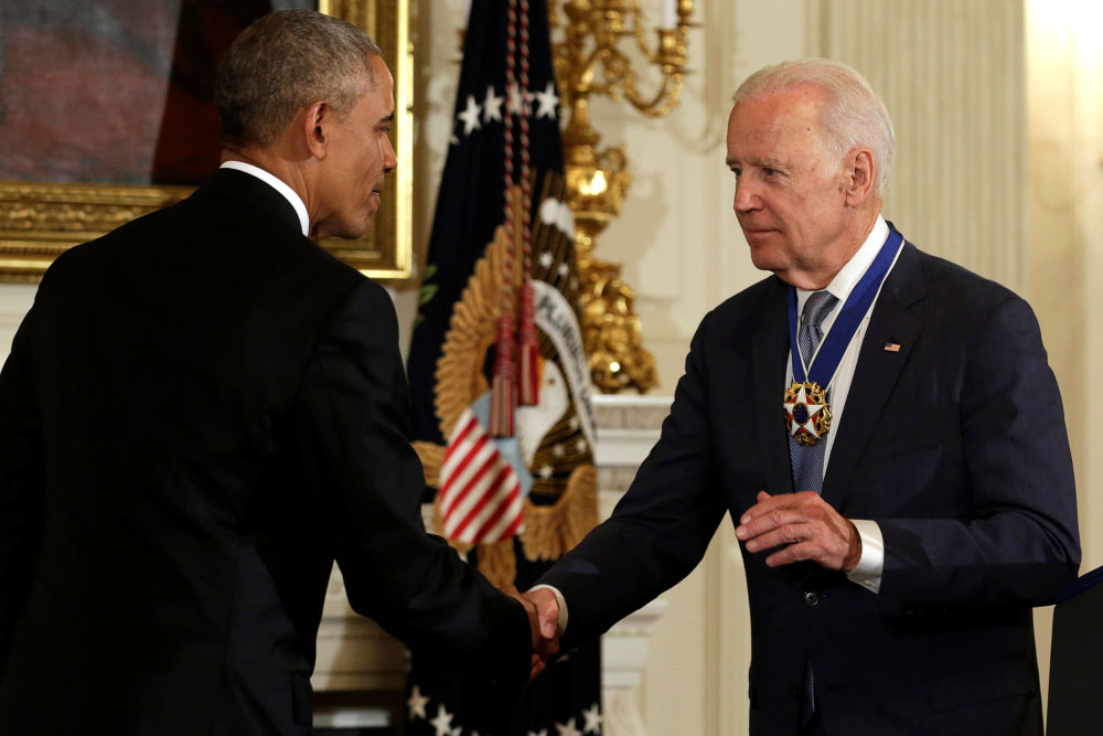 2017年1月12日,时任美国总统奥巴马(左)在华盛顿白宫为时任副总统拜登颁发“总统自由勋章”后握手。(新华社/路透)