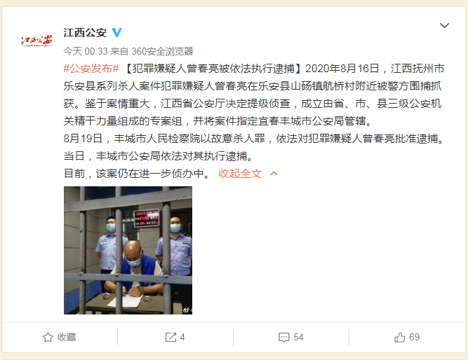 2020年8月16日,江西抚州市乐安县系列杀人案件犯罪嫌疑人曾春亮在乐安县山砀镇航桥村附近被警方围捕抓获。鉴于案情重大,江西省公安厅决定提级侦查,成立由省、市、县三级公安机关精干力量组成的专案组,并将案件指定宜春丰城市公安局管辖。