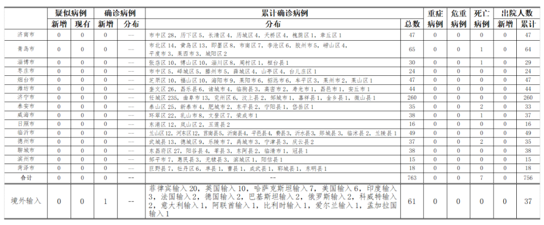 山东无本地住院疑似病例、确诊病例。累计报告确诊病例763例,死亡7例,治愈出院756例。