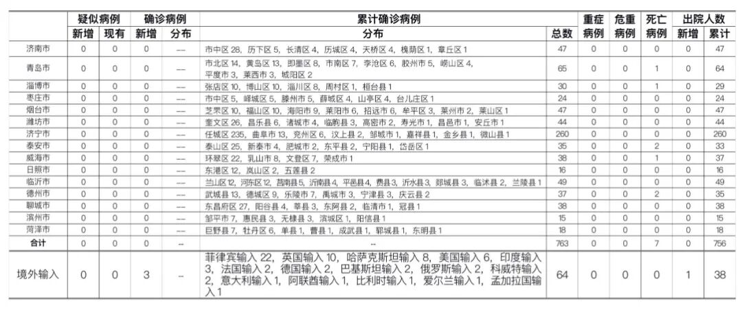 山东无本地住院疑似病例、确诊病例。累计报告确诊病例763例,死亡7例,治愈出院756例。