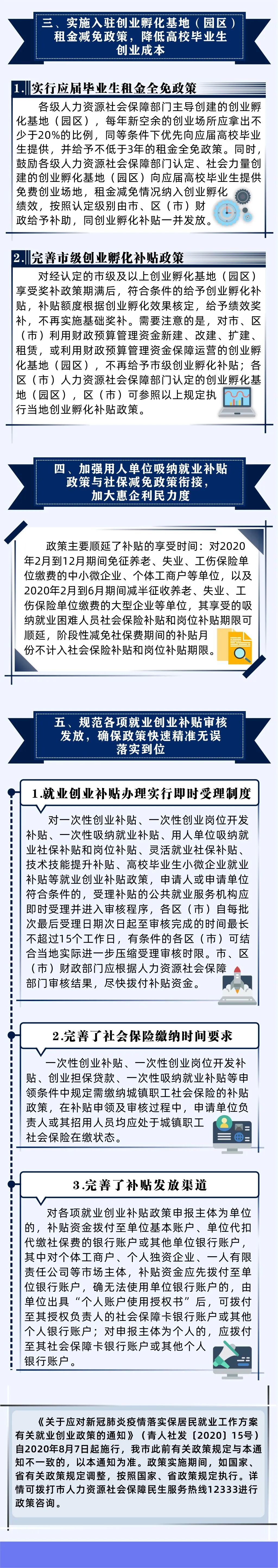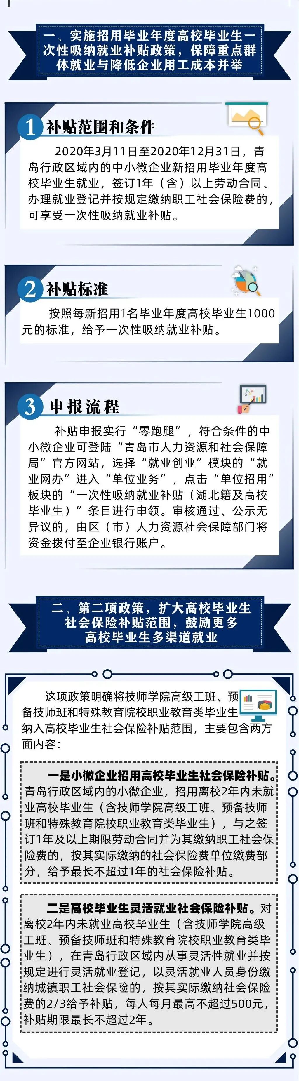 近日,青岛市委经济运行应急保障指挥部出台《青岛市保居民就业工作方案》,从发展经济、援企稳岗、重点群体就业、扩大培训、扶持创业、灵活就业、防控风险等7方面,提出26项工作任务,推动与保居民就业联动。为加快政策落地兑现,市人力资源社会保障局联合市财政局同步下发《关于应对新冠肺炎疫情落实保居民就业工作方案有关就业创业政策的通知》,对实施招用毕业年度高校毕业生一次性吸纳就业补贴、扩大高校毕业生社会保险补贴范围、实施应届高校毕业生入驻创业孵化基地(园区)租金减免政策、用人单位吸纳就业补贴政策与社保减免政策衔接、规范就业创业补贴发放等5项政策措施进行了明确。