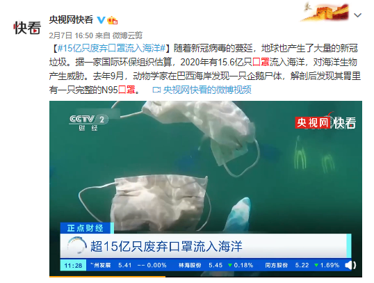 15亿只废弃口罩流入海洋!疫情垃圾成海洋生命威胁 2021-02-08 10:04 央视网快看微博 0 随着新冠病毒的蔓延,地球也产生了大量的新冠垃圾。据一家国际环保组织估算,2020年有15.6亿只口罩流入海洋,对海洋生物产生威胁。去年9月,动物学家在巴西海岸发现一只企鹅尸体,解剖后发现其胃里有一只完整的N95口罩。 微博截图 责任编辑:荣潇