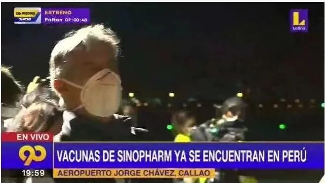 秘鲁总统弗朗西斯科·萨加斯蒂到机场迎接中国疫苗(视频截图)。
