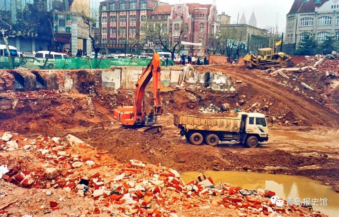 1998年拆除现场1998年3月30日,年近百岁的克里本多夫饭店旧址被拆除;继而,拓建的筒子楼、鲁大矿业旧址,以及1987年新建的印刷厂楼座先后被拆除。据后来担任青岛日报社社长的蔡晓滨先生回忆,虽然旧楼在拆除时墙面和砖块已酥软,但建筑的木框架依然完好,它载满了青岛报人半个世纪的情感记忆,在拆除之后,“老杨和同事们曾多番惋惜”。1998年11月28日,总建筑面积达2万多平方米的青岛日报社新建办公大楼宣告封顶。青岛日报社在其时金灿灿的阳光里,期待新世纪的到来。