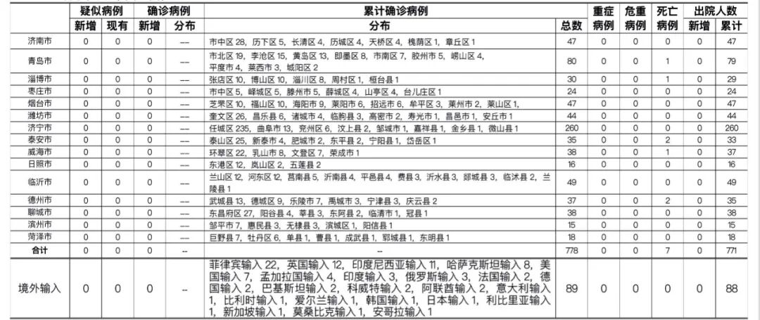 山东无新增本地疑似病例、确诊病例。累计报告确诊病例778例,死亡7例,治愈出院771例。