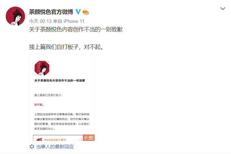 2月20日凌晨,茶颜悦色在微博再次公开致歉,“接上篇我们先自打板子”,并在致歉文字中显示了网友质疑的截图,称这些不妥文案产品的创作时间在2014年至2015年期间,“时间不是我们甩锅的借口,我们承认错误,也应当为我们的错误承担责任”。