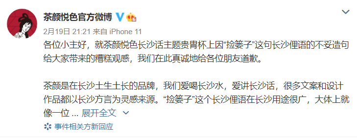 2月19日晚,茶颜悦色在其微博致歉:“就茶颜悦色长沙话主题贵胄杯上因“捡篓子”这句长沙俚语的不妥造句,给大家带来的糟糕观感,我们在此真诚地给各位朋友道歉。”