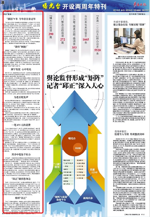 2020年6月,一筹莫展的他向青岛日报求助,他从北京转来青岛开办武术学校,递交申请3个多月了,还没有通过审批,致使其事业严重受阻。经过调查,青岛日报迅速推出了相关报道。在“曝光台”栏目的推动下,他很快拿到了学校审批“通行证”。后来,林先生的事业发展得风生水起,这也坚定了他扎根青岛影视土壤的决心。而这篇小小的报道,也让我感受到,手中的笔分量虽轻,却有千钧之力。那些署名“邱正”的文字,带着泥土的香气,带着热腾腾的希望,不仅关乎百姓的呼声,更关乎城市的未来。